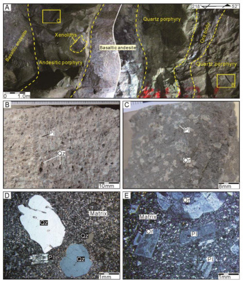The quartz porphyry features a grayish white color and a porphyritic texture in the hand specimen (Figure 3A,B). The phenocrysts in the quartz porphyry (1.0 × 1.5 mm2 to 1.0 × 2.0 mm2) are composed mainly of quartz (40–45 vol %), orthoclase (0–5 vol %) and plagioclase (10–15 vol %). Some plagioclase grains are variably sericitized. Quartz, orthoclase and plagioclase (<0.1 mm) can be identified in the matrix (30–35 vol %) (Figure 3D), and accessory minerals predominantly include zircon and altered mineral sericite.