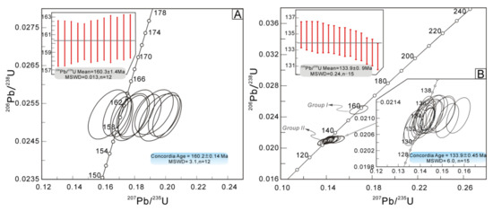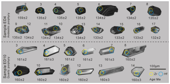 Zircon grains collected from the quartz porphyry (ED10) yielded 206Pb/238U ages of 160–161 Ma with a weighted mean 206Pb/238U age of 160.3 ± 1.4 Ma (n = 12) (Figure 7A). Zircon grains collected from the andesite porphyry (ED4) yielded 206Pb/238U ages of 132–135 Ma with a weighted mean 206Pb/238U age of 133.9 ± 0.9 Ma (n = 15) (Figure 6B). Zircon ages of 159 Ma (Group I) correspond to zircons trapped in the quartz porphyry, which is consistent with geological observations made in the field.