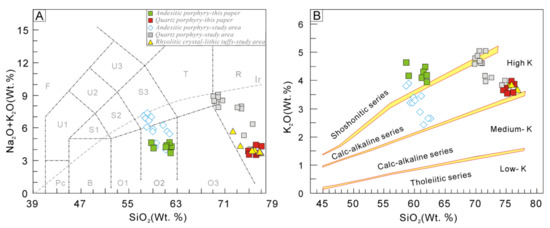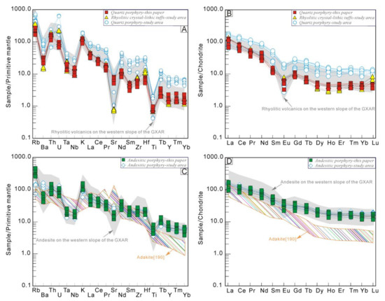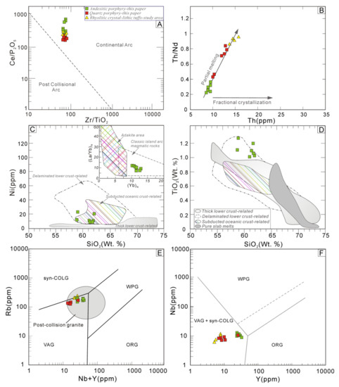 In Figure 6A (primitive mantle-normalized trace element spider diagram, [72]), the quartz porphyry samples are enriched in Th, U, and large ion lithophile elements (LILEs; e.g., Rb and K) and depleted in high field strength elements (HFSEs; e.g., Nb, Ta and Ti). Furthermore, the andesite porphyry samples feature lower contents of Th and U but higher contents of Ba, K, Ta and Nb than the host quartz porphyry samples (Figure 6C).