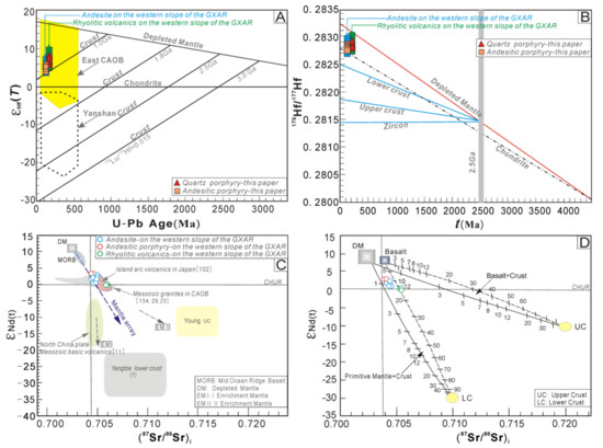 εHf(t) versus age plot of zircons (A) and 176Hf/177Hf versus age plot of zircons (B) [81,82]. (87Sr/86Sr)i–εNd(t) diagrams (C) and (D) of the andesite porphyry, andesite and rhyolitic volcanics on the western slope of the Great Xing’an Range (GXAR) [83]. Data for the andesite and rhyolitic rocks on the western slope of the GXAR are quoted from the literature [84,85,86,87,88,89].