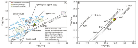 (A) 207Pb/204Pb versus 206Pb/204Pb diagram for the andesite porphyry, and (B) 208Pb/204Pb versus 206Pb/204Pb for the quartz porphyry in the Erdaohezi deposit (the base diagrams are from [88]).