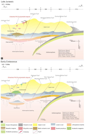 In this paper, we present new ages for the quartz porphyry and andesite porphyry of 160.3 ± 1.4 Ma and 133.9 ± 0.9 Ma, respectively. Moreover, on the basis of the ages of the felsic and intermediate intrusions related to Pb–Zn polymetallic mineralization in the Erguna metallogenic belt, we postulate that both types of intrusions formed primarily in the Late Jurassic or Early Cretaceous, with the felsic intrusions forming at 140–160 Ma and the intermediate intrusions forming at 133–148 Ma [101]. Thus, the ages of the quartz porphyry and andesite porphyry in the study area are similar to the ages of these intrusions.