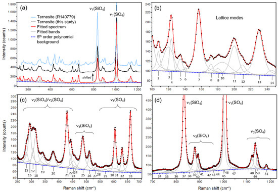 (a) Room-temperature (RT) Raman spectrum of the natural ternesite sample in the frequency range between 100 and 1230 cm−1 in comparison with a ternesite reference RT spectrum from the RRUFFTM spectral data base [18]. The fitted spectrum, the deconvoluted bands, and the simultaneously fitted 5th order polynomial background are also shown but shifted from the measured spectrum along the y axis for clarity. (b–d) Cutouts from the spectrum shown in (a) in the frequency ranges of (b) the lattice vibrations between 100 and 250 cm−1, (c) the internal bending modes of SO4/SiO4 groups between 250 and 700 cm−1, and (d) the internal stretching modes between 700 and 1230 cm−1, respectively. The bands are labelled with ascending numbers, which are used in Table 3 for easy assignment.