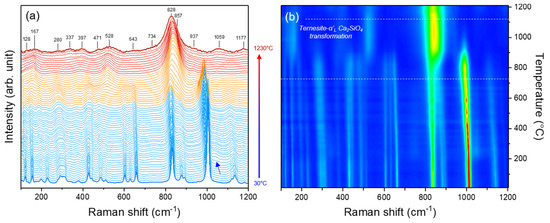 From Figure 2, it is further evident that the sulfate-related vibrational modes disappear between about 750 and 1000 °C (orange spectra in Figure 2a), even the very strong v1(SO4) band (Figure 2b). In this temperature interval, the overall number of observable Raman bands is largely reduced from 51 to 14 (red spectra in Figure 2a), reflecting a change in the crystal symmetry and, in particular, of the chemistry (loss of sulfur). A group theoretical analysis based on an orthorhombic structure of the HT polymorph of dicalcium silicate (α’L-Ca2SiO4) revealed 48 Raman active modes [20]. Note, however, that due to the low intensity and large broadening of the bands at HT, the number and positions of the bands were difficult to define. In any case, ternesite evidently decomposed to α’L-Ca2SiO4, CaO, and SO3↑. The formation of α’L-Ca2SiO4 is evidenced by the observation that the frequency of the v1(SiO4) band of ternesite merges at about 1120 °C with the HT frequencies observed for pure α’L-Ca2SiO4. Our values for the v1(SO4) band of the α’L-Ca2SiO4 plot are at lower wave numbers at a given temperature than two values from the literature [20] (Figure 3a). The literature data represent the maximum of the overall v1(SO4) band profile that, however, is composed of at least two bands, i.e., the v1(SO4) and a v3(SO4) band, which both were considered in the fitting procedure.