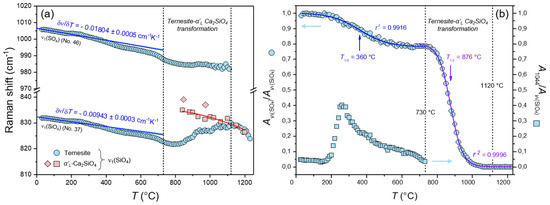 (a) The frequency of the v1(SO4) and v1(SiO4) bands of ternesite as a function of temperature. Stippled lines mark the onset and end of the ternesite-to-dicalcium silicate phase transition between about 730 to 1120 °C, respectively. The published high-temperature (HT) Raman frequencies of α’L-Ca2SiO4 [20] and own preliminary and unpublished HT data along with a quadratic fit (red curve) are also shown. Blue lines represent linear least-squares fits to the data below 160 °C (n = 14). (b) The temperature dependence of the integrated intensity ratios Av1(SO4)/Av1(SiO4) (blue circles, left axis) and A1044/Av1(SiO4) (blue squares, right axis) between both v1 bands, normalized between 0 and 1, and between the weak band near 1044 cm−1 and the v1(SO4) band, respectively. The blue and purple curve represent least-squares fit of a sigmoidal Boltzmann function to the data between RT and 730 °C and between 700 and 1230 °C, respectively. See text for more details.