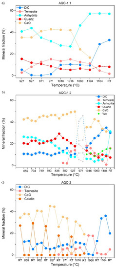 The evolution of the mineral fractions (DiC = dicalcium silicate, ternesite, quartz, anhydrite, CaO, calcite, and Wo = wollastonite) within the imaged volume as a function of temperature and time. (a) Experiment AQC-1.1, (b) experiment AQC-1.2 (light grey circles correspond to a failed measurement, where the focus was lost), and (c) experiment AQC-2 (contents of anhydrite and quartz are not shown here).