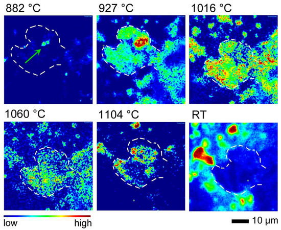 From 927 ± 5 °C, ternesite could be identified in various spectra throughout the imaged area. However, the nucleation and growth of ternesite inside dicalcium silicate grains became first visible within the hyperspectral Raman images at 971 ± 5 °C. After stepwise heating/quenching of the green body to/from higher temperatures, ternesite continuously grew at the expense of α’L-Ca2SiO4 until 1060 ± 5 °C (Figure 5c). Interestingly, during each quenching step, many ternesite grains that were present at high temperatures appeared to be transformed into larnite. During heating to 1104 ± 5 °C and quenching to RT, dicalcium silicate crystallized at the expense of ternesite, although some small grains of ternesite remained at RT (Figure 8). From Figure 5c, it can be deduced that, in our experiments, ternesite was stable within an in situ temperature range between 927 and 1060 ± 5 °C. On the other hand, if only the results of the quenched sample (ex situ) are considered, it could be concluded that the upper stability limit for ternesite was 1104 ± 5 °C.