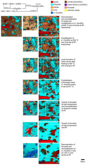 The experiment AQC-2 was carried out using the same precursor materials as in experiments AQC-1.1 and AQC-1.2. In Figure 7, we show the hyperspectral false-color Raman images that were taken during firing at any high temperature and quenching step, as well as notes to the predominant reactions that can be derived from each in situ image. During firing to the first temperature step of 838 ± 5 °C, calcite decomposed to CaO and CO2 but recrystallized during the following quenching steps. This demonstrated that, in addition to a high sulfur fugacity, there also must have been a high CO2 fugacity in the furnace. However, in the course of the sintering experiment, less and less CaO was formed at high temperatures and therefore less and less calcite could be identified at RT (Figure 5c). At 838 ± 5 °C, dicalcium silicate (α’L-Ca2SiO4) was detected, which transformed to larnite during cooling. Moreover, some isolated calcio-olivine (γ-Ca2SiO4) crystals were identified by their Raman band near 813 cm−1 [20], which were located near a large quartz grain (Figure 7).