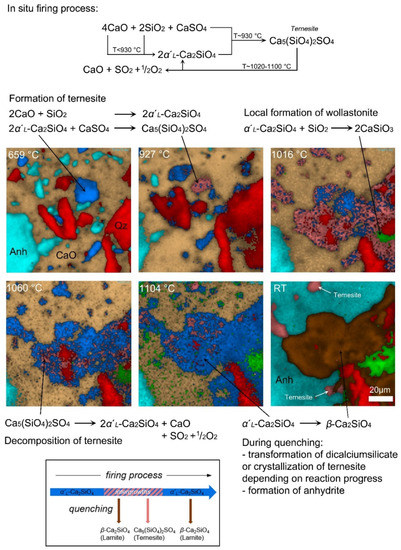 In all experiments, ternesite could be identified at temperatures of about 930 °C. From the time- and temperature-resolved images (Figure 4, Figure 6 and Figure 7), it is apparent that the formation of Ca5(SiO4)2SO4 is related to the reaction between dicalcium silicate and anhydrite:
