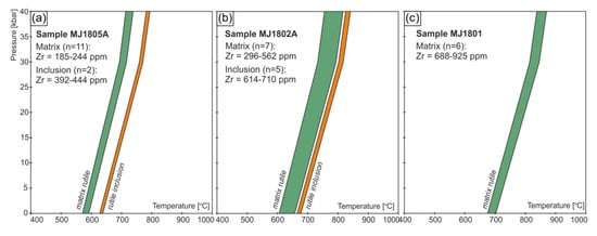 P-T diagrams showing the results of Zr-in-rutile geothemometry for a given textural types of rutile. Green fields show the results for matrix rutile, whereas the orange fields represent temperature range calculated for rutile inclusions. (a) Sample MJ18-05A: migmatitic paragneiss. (b) Sample MJ18-02A: migmatitic paragneiss. (c) Sample MJ18-01: garnet amphibolite.