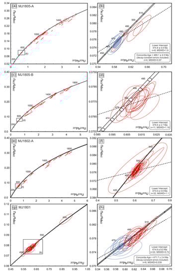 Concordia diagrams of zircon U-Pb analyses. (a) All analyses from sample MJ18-05A. (b) Caledonian age cluster from sample MJ18-05A. The lower intercept calculated for the whole cluster, concordia age calculated for the analyses marked by blue circle. (c) All analyses from sample MJ18-05B. (d) Caledonian age cluster from sample MJ18-05B. (e) All analyses from sample MJ18-02A. (f) Caledonian age cluster from sample MJ18-02A. (g) All analyses from sample MJ18-01. (h) Caledonian age cluster from sample MJ18-01. The lower intercept was calculated for the whole cluster, the concordia age was calculated for the analyses marked by blue circle.