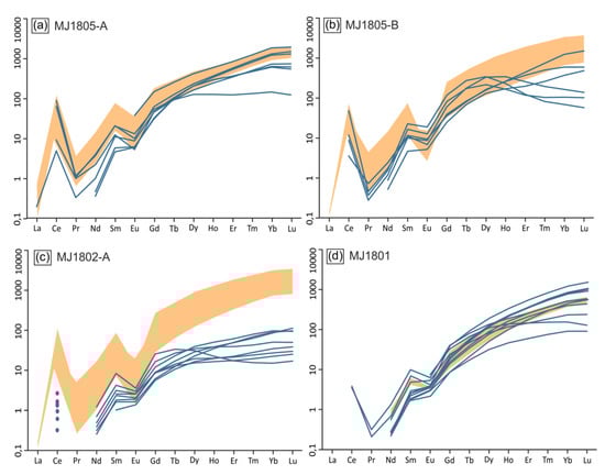 Chondrite-normalized REE patterns in zircon. Orange and blue lines represent zircon cores and rims, respectively. (a) Sample MJ18-05A: migmatitic paragneiss. (b) Sample MJ18-05B: migmatitic paragneiss. (c) Sample MJ18-02A: migmatitic paragneiss. (d) Sample MJ18-01: garnet amphibolite.