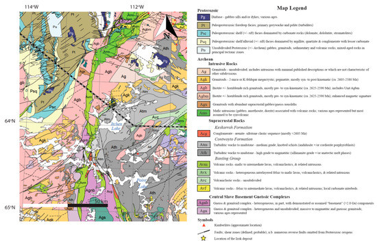 The Izok Lake VMS deposit is located in the central Slave Province, Canada, a granitic-greenstone terrane comprising deformed and metamorphosed Archean rocks hosting the Yellowknife Supergroup, a package of 2.67–2.70 Ga metasedimentary and metavolcanic rocks [19]. The Yellowknife Supergroup is divided into the lower Point Lake Formation (a suite of mafic tholeiitic to felsic calc-alkaline metavolcanic rocks and derived metasedimentary rocks, part of the Banting Group) and the upper Contwoyto Formation (a series of iron formation-bearing greywacke turbidites) (Figure 1). These formations host numerous granitic plutons along with N–NW trending regional diabase dykes of the Helikian Mackenzie Swarm [20,21].