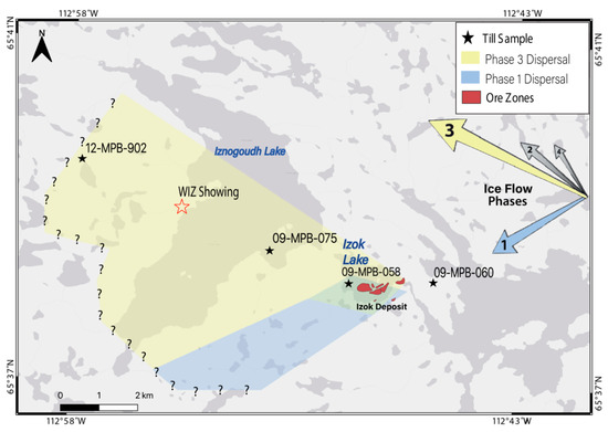 The GSC carried out a reconnaissance-scale till geochemical survey in the Point Lake region, including the Izok Lake area, but geochemical analysis of the <0.002 mm and <0.063 mm till fractions did not indicate the presence of the mineralization at Izok Lake [38]. In 2009, a till geochemical survey was carried out around the Izok Lake deposit [17] along with a detailed bedrock and till indicator mineral survey. The <63 µm fraction of till, analyzed by aqua regia/inductively coupled plasma mass spectrometry (ICP-MS), yielded elevated values for Zn (<346 ppm), Cu (<322 ppm), Pb (<392 ppm), Fe (<1880 ppm), Ag (<1411 ppb), Cd (<1.36 ppm), Bi (<5.12 ppm), Hg (<247 ppb), Se (<0.5 ppm), In (<0.28 ppm), and Tl (<0.20 ppm) up to 6 km down ice to the northwest [11]. Also in 2009, a gossan containing sphalerite and referred to as the West Iznogoudh (WIZ) showing (Figure 2; [27]) was sampled. Oviatt [39] reported elevated contents of Zn, Ag, Cu, Hg, and Bi in the <63 µm fraction of till collected in the vicinity of the showing.
