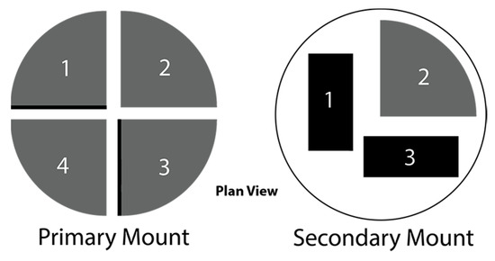 The grain mounting method used in this study was modified after Blaskovich [41]. In our study, the entire mass of each of the 16 subsamples was mixed with vacuum-evacuated epoxy and poured into a 2.54 cm diameter plastic ring mold. Each ring mold was immediately placed into a vacuum chamber under full vacuum for 5 min. Vacuum impregnation eliminated air bubbles from liquid epoxy and drew epoxy into void spaces in mineral grains, maximizing the adhesion between epoxy and grains [42]. Following removal from the vacuum chamber, the mounts were allowed to cure for 24 h. The resulting grain mount was trimmed and vertically quartered using a Raytech Jemsaw 45 (Raytech Industries, Middletown, CT, USA) fitted with a diamond-impregnated blade. One quarter of each mount was archived. The other three quarter-pieces were remounted into a single plastic ring mold and set with epoxy (Figure 3) and cured for 12 h. Thus, one new epoxy mount containing three quarter slabs was prepared for each of the 16 subsamples. After polishing to 1 µm, these three slabs in the secondary mount were used for MLA analysis and examination of any settling effects or gradients that developed during mixing with epoxy and curing of the primary mount. Following polishing, the mounts were carbon coated using a Denton Vacuum Desk V carbon-coater (Denton Vacuum LLC, Moorestown, NJ, USA).