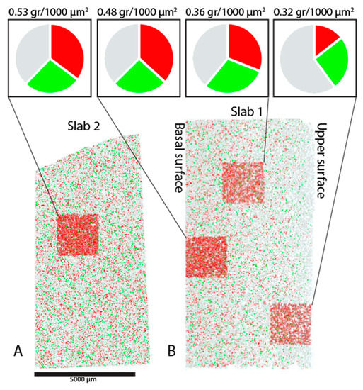 Carbon-coated grain mounts were analyzed using XBSE mode on a FEI Quanta 650 FEG SEM (Thermo Fisher Scientific, Waltham, MA, USA) operating under high vacuum at QFIR. The XBSE measurement mode collects a BSE image of each frame and uses variances in grey-level to define phase boundaries on a sample surface. This is followed by collection of a single EDS spot analysis at the calculated centroid of each identified phase. Operating conditions included a beam current of 10 nA, an accelerating voltage of 25 kV, and a spot size of 6. Backscattered electron image brightness and contrast were standardized to a gold (Au) imaging standard. Minimum feature size for image detection and minimum grain size for EDS analysis were both set to 4 µm. Magnification was set to 250× with a resolution of 1000, resulting in a pixel size of 2.14 µm and a horizontal field width of 2.14 mm. Each basal quarter contained between 75 and 210 frames for analysis, whereas each vertical section contained between 100 and 200 frames. Analysis of a single grain mount took between 35 min and 2.5 h, depending on the dimensions of the vertical slabs and the number of particles to analyze (Figure 3, slabs 1 and 3). Basal sections (Figure 3, slab 2) contain between 5000 and 50,000 particles.