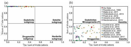 - Bačík, P.; Fridrichová, J.; Uher, P.; Pršek, J.; Ondrejka, M. The crystal chemistry of gadolinite-datolite group silicates. Can. Mineral. 2014, 52, 625–642. [Google Scholar] [CrossRef]