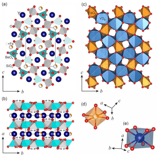 - Chukanov, N.V.; Aksenov, S.M.; Rastsvetaeva, R.K.; Kristiansen, R.; Pekov, I.V.; Belakovskiy, D.I.; Van, K.V.; Bychkova, Y.V.; Britvin, S.N. Crystal structure of the OH-dominant gadolinite-(Y) analogue (Y,Ca)2(Fe,□)Be2Si2O8(OH,O)2 from Heftetjern pegmatite. Acta Crystallogr. 2017, B73, 899–906. [Google Scholar]