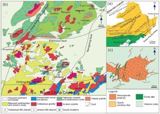 - Zeng, Q.; Liu, J.; Zhang, Z.; Chen, W.; Zhang, W. Geology and geochronology of the Xilamulun molybdenum metallogenic belt in eastern Inner Mongolia, China. Int. J. Earth Sci. 2011, 100, 1791–1809. [Google Scholar] [CrossRef]