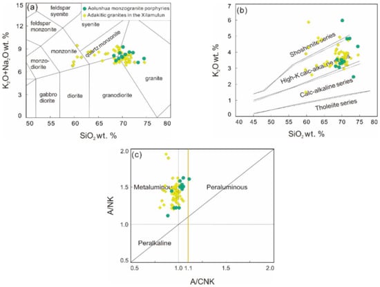 Plots of (K2O + Na2O) vs. SiO2 (a), K2O vs. SiO2 (b), and A/CNK–A/NK (c) of adakitic granites in the Xilamulun district. Use LOI-free SiO2 for all plots in this study. Data sources of adakitic granites are from references [,,,,,].