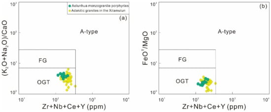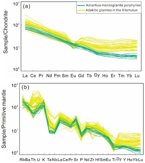 Rare earth elements (REEs) and trace element distribution diagrams for Aolunhua monzogranite porphyries and adakitic granites in the Xilamulun district. (a) Plots of chondrite-normalized REE patterns; (b) Primitive mantle-normalized spider diagram. Primitive-mantle and chondrite normalization values are from Sun and McDonough [] and Boynton [], respectively. Data sources of adakitic granites are the same as those in Figure 3.