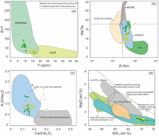 Plots of (a) Sr/Y vs. Y, (b) Nb/Ta vs. Zr/Sm, (c) K2O/Na2O vs. CaO/Al2O3, and (d) MgO vs. SiO2 for the Aolunhua monzogranite porphyries and adakitic granites in the Xilamulun district, southern Great Xing’an Range, NE China. (a) Fields of adakites and classical island andesite–dacite–rhyolite (ADR) rocks are modified from Defant and Drummond [], partial-melting curves are calculated for batch melting of the mafic lower crust (Y = 16.5 ppm and Sr/Y = 21) with melt fractions (white circles) on each of the model curves; (b) Fields of island arc basalts, mid-ocean-ridge basalt (MORB), Trondhjemite–Tonalite–Granodiorite (TTG), and adakites are from Foley et al. []; (c) Slab-derived adakites are from Kamei et al. []; Kay et al. []; Stern and Kilian []; Yogodzinski et al. [], lower crustal-derived adakites are from Guan et al. []; (d) Metabasaltic and eclogite melts (1–4.0 GPa) after Rapp et al. [], subducted oceanic crust-derived adakites after Wang et al. [], thickened and delaminated lower crust–derived adakites after references [,,], Low-SiO2 adakites and high-SiO2 adakites after Martin et al. []. Data sources of adakitic granites are the same as those in Figure 3.