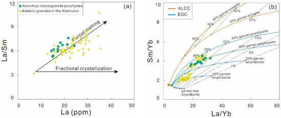 Diagrams of La vs. La/Sm (a) and Sm/Yb vs. La/Yb (b) for the Aolunhua monzogranite porphyries and adakitic granites in the Xilamulun district: (a) showing a partial melting trend for adakitic rocks; (b) the modal–batch melting curves are inserted in the Figure 7b. Partition coefficients are from Mckenzie and Onions [] and Adam and Green []. Lower continental crust [] and average N–MORB [] were used as representative for amphibolitic lower continental crust (ALCC) and eclogitic oceanic crust (EOC) end–members, respectively. Data sources of adakitic granites are the same as those in Figure 3.