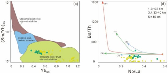 Experimental studies suggest that the composition of source rocks plays a crucial role for generating adakitic melts with different geochemical characteristics and that this can occur in <50 km thick crust [,]. The Aolunhua monzogranite porphyries show enrichment in Sr (362–809 ppm), depletion in Y (7.66–10.5 ppm) and Yb (0.54–0.95 ppm), with high Sr/Y ratios (34.59–91.02). These geochemical signatures indicate that they are typical of adakitic rocks. This is also supported by the depletion of HFSEs (negative Nb, Ta, and Ti anomalies in primitive mantle-normalized spider diagram, Figure 4b). Furthermore, as both Nb and Ta are immobile elements and are hardly affected by fractional crystallization or hydrothermal overprint in later geological events, intermediate Nb/Ta ratios (Table 2) can be used to trace magma sources []. As shown in Figure 4b, the negative Nb and Ti concentration anomalies rule out the origin of normal mid–ocean–ridge basalt (N–MORB) or ocean island basalt (OIB)–type sources in non-subduction zone environments, with associated melts characterized by typically positive Nb and Ti anomalies []. The studied samples have low Mg# values (36.09–48.63), Ni (<20 ppm), and Cr (<10 ppm) contents, which is inconsistent with melts derived from classical primary mantle []. Instead, they mostly exhibit geochemical characteristics of high–K calc–alkaline affinities consistent with melts from partial melting of continental crust (Figure 3b). Normally, potassium concentration in melt is controlled by the presence of K–bearing phases in the residue and the degree of partial melting [], thus the K2O contents of adakitic rocks can provide additional information for deciphering their source. Typical adakites derived from oceanic slab have lower K2O/Na2O and higher CaO/Al2O3 than those of lower crustal-derived adakites because of K-bearing phases in the residue and small degrees of partial melting of eclogitic mid-ocean-ridge basalt (MORB) []. The Aolunhua samples exhibit high K2O/Na2O (0.62 to 1.83) and low CaO/Al2O3 (0.12–0.18) ratios that are distinct from those of melts derived from oceanic slab, but closely resemble lower crustal derived adakitic rocks (Figure 5c). In addition, relatively low MgO contents (0.62–1.04) of the Aolunhua samples are consistent with experimental melts originated from metabasalt and eclogite at 1–4.0 GPa with involvement of mafic magmas derived from lithospheric mantle or melting of thickened lower crust (see Figure 5d) [,]. This result is consistent with the occurrence of mafic microgranular enclaves (MMEs) in these granitic porphyries from the Aolunhua district [], indicating that a crust-mantle interaction process is necessary for the generation of monzogranite porphyries. Moreover, compared to classical adakites derived from young subducted oceanic slab, the samples possess slightly enriched (87Sr/86Sr)i ratios of 0.7051 to 0.7058 and negative εNd(t) values varying from −2.98 to 0.92, with young T2DM values of 0.84 to 1.16 Ga, which are similar to adakitic rocks in this region [,,,,,,,,,,,,,,]. Considering these geochemical signatures of adakitic granites in the Xilamulun district, it is suggested that they are not partial melting products of depleted mantle or oceanic slab sources because of the reasons discussed above. Instead, these granitic rocks exhibit geochemical affinity of a dominantly juvenile mafic lower crustal source. Therefore, the geochemical data combined with Sr–Nd isotopic compositions (Figure 6) suggest that Aolunhua monzogranite porphyries and adakitic granites in the Xilamulun district are the results of partial melting of juvenile lower continental crust, with continuous magmatic underplating supplying the heat for melting.