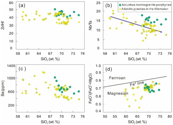 Diagrams of Zr/Hf vs. SiO2 (a), Nb/Ta vs. SiO2 (b), Ba vs. SiO2 (c), and FeOT/(FeOT + MgO) vs. SiO2 (d) for the Aolunhua monzogranite porphyries and adakitic granites in the Xilamulun district. (a) A relatively constant range of Zr/Hf ratio for adakitic rocks, probably indicating no intensive fractional crystallization in the evolutionary process; (b) a slightly decreasing Nb/Ta trend for adakitic rocks, indicating a small fractional crystallization of Fe–Ti oxides; (c) a slightly decreasing trend of Ba contents for adakitic rocks, suggesting a small fractional crystallization of plagioclase; and (d) samples are plotted in magnesian area with minimal iron-enrichment, indicating that these adakitic rocks are probably related to relatively oxidizing magmas, Fe* line is FeOT/(FeOT + MgO) = 0.486 + 0.0046 × SiO2 (wt. %) (after Frost et al. []). Data sources of adakitic granites are the same as those in Figure 3.