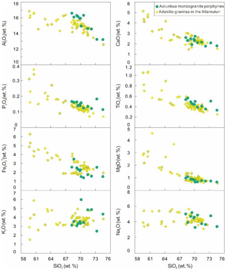 Harker diagrams for the Aolunhua monzogranite porphyries and adakitic granites in the Xilamulun district. Data sources of adakitic granites are the same as those in Figure 3.