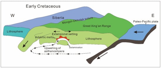 Adakitic rocks associated with Mo mineralization provide a probe to constrain the geodynamic setting for Mo deposits. As presented in recent studies, adakitic rocks formed from the partial melting of continental crust are widely used as a geodynamic indicator of lithospheric delamination, orogenic collapse, or crustal thickening [,]. Crustal thickening is common in a continental collision orogeny caused by object extrusion pressure, where deep-seated adakitic melts (derived from >50 km depth) occur at high pressure. However, this situation is rare in intraplate settings []. Generally, lower crust-derived adakitic rocks in orogenic setting have high (Sm/Yb)SN and low YbSN because of a garnet-rich residue in the source region which decreases the Yb content in melts. In contrast, adakites derived from intraplate lower crust without thickening have lower (Sm/Yb)SN and higher YbSN []. Our samples plot in the fields of intraplate adakites in an (Sm/Yb)SN vs. YbSN diagram (Figure 8c), indicating that the Aolunhua monzogranite porphyries were not generated in a crustal thickening or orogenic collapse setting, but a common intraplate setting. This is also supported by the Ba/Th vs. Nb/La for modelled melts from partial melting of mafic normal lower crust (depth <33 km, see Figure 8d), not a thickened lower crust. Considering the rock assemblage and evolutionary history in this area, the extensional setting is also supported by the presence of widespread coeval A-type granites, calc–alkaline volcanic rocks formed by decompressional partial melting of lithospheric mantle, metamorphic core complexes, and numerous mafic and felsic dykes [,,]. This result is also consistent with previous studies suggesting that NE China was in an extensional environment related to lithospheric delamination during the Early Cretaceous [,,,,]. Thus, we favor a lithospheric mantle delamination model to interpret the occurrence of Early Cretaceous adakites in the Xilamulun district. These adakitic rocks may be generated in an extensional setting related to lithospheric delamination, as the depicted in Figure 11. The collision between North China and Siberian cratons around 160 Ma blocked the westward movement of the lithosphere which induced the subduction of the Pacific plate and led to lithospheric delamination triggered by asthenospheric upwelling and underplating. Subsequently, the heat from mantle caused partial melting of mafic lower crust, which result in Early Cretaceous magmatic activities of adakitic rocks and associated Mo mineralization in the southern Great Xing’an Range.