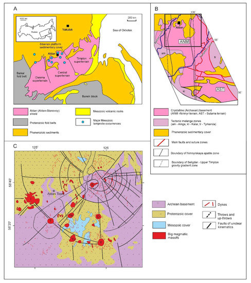 (A) Simplified geological map of the Aldan-Stanovoy shield and adjacent fold belts (after [12]); (B) Geological scheme of the Central Aldan super terrane (after [27,28]). A rectangle on (B) outlines the area, represented on the inset (C). (C) Simplified geological map of the Mesozoic Central Aldan potassic province (after [31]). Main intrusive massifs: I—Inagli, T—Tommot, Ya—Yakokut, Yu—Yukhtinsly; D—Dzhenkondinsky, Y—Yllymakhskiy; R—Ryabinoviy.