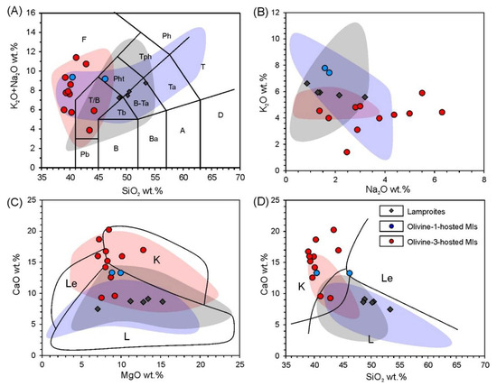 Major element variation diagrams for the studied rocks and homogenized melt inclusions. Fields for comparison: grey—Aldan Shield lamproites, blue—Mediterranean lamproites, red—Mediterranean kamafugites and high-Ca leucitites. Compositions used for the fields are from GeoRoc database (http://georoc.mpch-mainz.gwdg.de/georoc/, accessed on 25 September 2019). Fields for lamproites (L), kamafugites (K) and leucitites (Le) are outlined as in [3]. Fields on total alkalis—silica (TAS) plot [53] on inset (A) are labeled with the following abbreviations: F—foidite, Ph—phonolite, Tph—tephriphonolite, Pht—phonotephrite, T/B—tephrite/basanite, Pb—picrobasalt, Tb—trachybasalt, B–Ta—basaltic trachyandesite, Ta—trachyandesite, T—trachyte/trachydacite, D—dacite, A—andesite, Ba—basaltic andesite, B—basalt. (B) K2O–Na2O plot; (C) CaO–MgO plot with outlined classification fields [3]; (D) CaO–SiO2 plot with outlined classification fields [3].