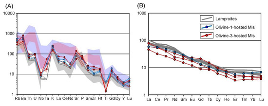 Incompatible element concentrations in the glasses of the heated inclusions show moderate variance (Table 3, Table S3). Inclusions hosted by both olivine-1 and olivine-3 have almost identical trace element systematics, aside from Ti, which is higher in olivine-1, and Zr, which is higher in olivine-3 (Figure 4A). Plotted on a spider diagram, PM-normalized [51] values of incompatible elements show uniform enriched patterns with distinct negative anomalies for Ta, Nb and Ti, and positive anomalies for K, Sr, U and Gd (Figure 4A). Chondrite-normalized [52] REE plots show smooth enriched patterns for the inclusions in both types of olivine, being very similar to whole-rock compositional trends of the lamproites (Figure 4B).