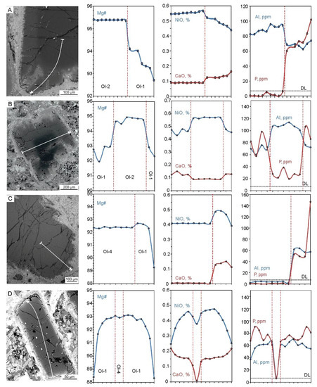 SEM BSE images and EPMA element profiles of olivine grains. (A) Olivine-2 with a rim of olivine-1. (B) Olivine-1 with an olivine-2 core. (C) Olivine-4 with a rim of olivine-1. (D) Olivine-1 with an olivine-4 core. White arrows on the SEM BSE images show compositional profile directions. Abbreviations: DL—detection limit, Ol—olivine.