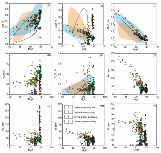 Binary elemental plots showing variation in olivine types. (A) NiO—Mg# binary plot; (B) CaO—Mg# binary plot; (C) MnO—Mg# binary plot; (D) Al—Mg# binary plot; (E) Cr2O3—Mg# binary plot; (F) Zn—Mg# binary plot; (G) Na—Mg# binary plot; (H) Ti—Mg# binary plot; (I) P—Mg# binary plot. Oxide concentrations are plotted in weight %, element concentrations—in parts per million (ppm). Fields for comparison: blue—low-Ti lamproites worldwide, pink—high-Ti lamproites worldwide, black outline—kamafugites, red outline—mantle olivine compositions. Fields are outlined using data from GeoRoc database (http://georoc.mpch-mainz.gwdg.de/georoc/, accessed 25 September 2019), [54] and [55].