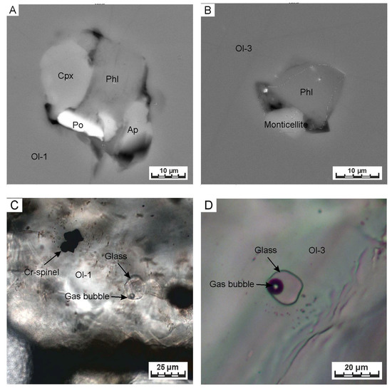 Representative microphotographs of the olivine-hosted inclusions. (A,B) Unheated inclusions within the olivine-1 and the olivine-3, respectively (SEM BSE photo). (C,D) Heated and quenched inclusions within the olivine-1 and the olivine-3, respectively (transmitted light). Abbreviations: Ol—olivine, Cpx—clinopyroxene, Phl—phlogopite, Ap—apatite, Po—pyrrhotite.