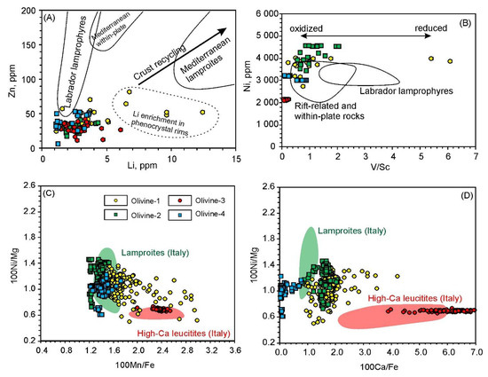Characteristic elemental variations in olivine. Fields on (A,B) are based on data from [18,20]. Fields for lamproitic and leucititic olivine on (C,D) are as given in [67].