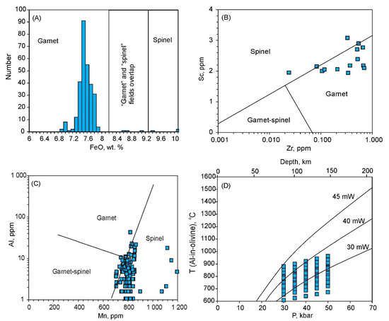 Numerous studies indicate that Fe, Mn, Zn, V, Sc and Zr are sensitive to the presence of spinel and garnet in mantle assemblages. According to [77], the studied olivine-4 (FeO 7–8 wt.%) fits in the garnet peridotite range (Figure 11A). However, trace element discrimination diagrams are ambiguous: on the Sc–Zr plot, the compositions are transitional between the “spinel” and “garnet” fields, while on the Al–Mn plot, they correspond primarily to the “spinel” field (Figure 11B,C). However, data obtained by [77], show that Mn is not very sensitive to the presence of spinel or garnet. Low Y (below detection limits) and broad variations in Zn content in olivine-4 is more akin to garnet peridotites, rather than from spinel [76]. In addition, the presence of Cr-pyrope xenocrysts in the lamproite and lamprophyre dikes provide further evidence of garnet prevalence in the SCLM parental magma for the Aldan lamproites [78].