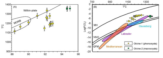 Results of olivine-spinel thermometry and oxybarometry, applied to olivine-1 and olivine-2. In (A), reference fields for olivine from MORB and within-plate basalts are drawn using data from [65] and [81]. In (B), reference fields for lamproites from different localities are outlined using data from [6], [83] and [84]. The numerical data is listed in Table S5.