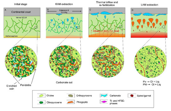 Schematic detailing the simplified genetic model for generation of the kamafugite-like (KAM) and lamproite (LAM) melts from a veined and modified lithospheric source. (A) Initial stage before the activation; (B) First stage: generation of a kamafugite-like melt; (C) Temperature increase and re-fertilization of the veined SCLM; (D) Extensive melting and generation of a lamproite melt.