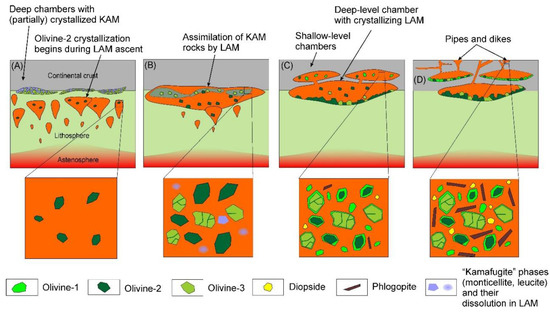 Schematic outlining processes of magma assimilation and the olivine crystallization sequence (types 1–3). (A) Uprise of a newly formed lamproite melt; (B) Accumulation of the lamproite melt in under-plated chambers and partial assimilation of cumulates, crystallized from a kamafugite-like melt; (C) crystallization of the resulting magma in deep- and shallow-level chambers; (D) emplacement of subvolcanic intrusions and ultimate solidification of the rocks.