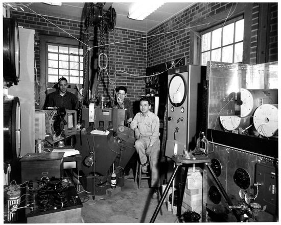 Alfred University, 1960: Taro Takahashi’s high-pressure lab equipped with a tetrahedral multi-anvil apparatus. Taro is on the right and his graduate student at the time, Ed Schreiber, is in the center. It was shortly after this (about 1963) that Taro accepted an offer at the University of Rochester and continued his high-pressure research, while Ed moved to Lamont Geological Observatory as a member of the research faculty to pursue high-pressure experiments in the Mineral Physics laboratory of Orson Anderson. (Photo courtesy of Taro Takahashi and Bob Liebermann).