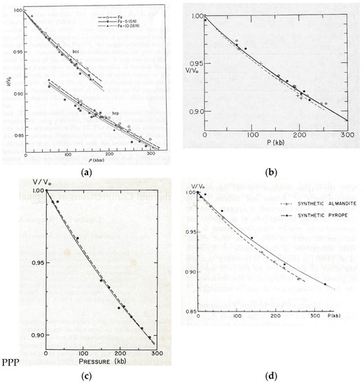 Four examples of early measurements of isothermal compression at 25 °C of phases important for interpreting data concerning the Earth’s interior using lattice parameters based on X-ray diffraction (a) Fe, Fe-5.15 Ni , Fe-10.26 Ni [5]; (b) Three spinel phases of synthesized Fe2SiO4 (open circles), Fe1.8Mg0.2SiO4 (pluses), Fe1.6Mg0.4SiO4 (closed circles) [6]; (c) Spinel phase of synthesized Co2SiO4 dashed and solid lines by two slightly different least-square fits [7]; (d) Two garnet compositions [8].
