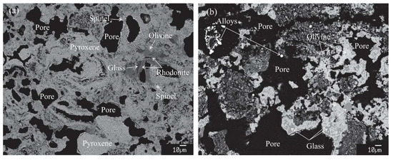 Pre-reduction was conducted to calcinate nodules and enable nickel, copper, cobalt and iron oxides to be partly reduced. The microstructures of samples ND2 and ND9 after pre-reduction at 1000 °C for 60 min are shown in Figure 5. In Figure 5a, the sample ND2 contains pyroxene ((Si, Ti, Mn)O2∙(Al, Fe)2O3∙(Mn, Fe, Mg, Ca, Ni)O), rhodonite ((Mn, Ca, Mg)O∙SiO2), spinel ((Al, Fe)2O3∙(Mn, Fe, Mg, Ca, Ni)O),), olivine 2(Mn, Mg, Ca, Ni, Fe)O∙SiO2, and glass phases. At 1000 °C, the mineral SiO2-Al2O3 incorporated with low melting point oxides K2O and Na2O may diffuse and react with MnO-FeO phases. Some reactions occurred in the local area near the pore, where olivine and liquid together with rhodonite were formed. Metals were not observed in the samples after pre-reduction due to the insufficient reductant addition. In Figure 5b, alloy droplets were observed by the reduction with more reductant addition. Olivine and liquid phases were formed in the sample ND9. The alloy and liquid compositions are 38.4Ni-36.1Fe-19.7Cu-3.4Co-2.3Mn and 49.7SiO2-13.4MnO-11.8Al2O3-12.9Na2O-5.5K2O-2.5FeO-2.8CaO-0.7MgO-0.6TiO2, respectively.
