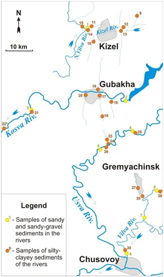 The study areas are located at the Vilva, Usva (the Chusovaya River basin), Kizel, Vilva (the Yaiva River basin), and Kosva Rivers and their tributaries, into which the mine water is discharged or has ever been discharged. The sampling scheme takes into account background areas that were not affected by anthropogenic factors. Suspended load material (aleurite clayey sediments) and bottom load material (sandy and sandy-gravel) were sampled. A total of 72 samples were taken at 36 sites. The locations of some sampling point are shown in the scheme (Figure 1).