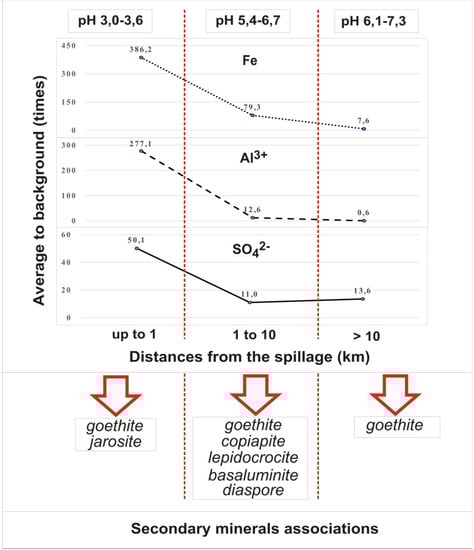 Downstream, at a distance of 1 to 10 km from mine spills, the content of water-soluble substances is reduced by 2–3.5 times. The content of water-soluble substances is changed to sulfate-iron-calcium and sulfate-calcium within pH 5.4–6.7. The content of sulfates decreases by 3–4 times, iron—by 6.5–7 times and aluminum—by 18–49 times. In these areas, the influence of mine waters is associated with the formation of secondary minerals such as goethite, lepidocrocite, copiapite in river sediments, and with the additional influence of runoff from mine dumps in the sediments are present basaluminite and diaspore.