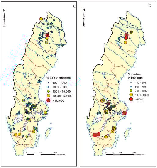 Simplified map of lithogeochemical data in Sweden: (a) total REE + Y > 500 ppm and (b) Y content >100 ppm (source of data: lithogeochemical database at the Geological survey of Sweden).