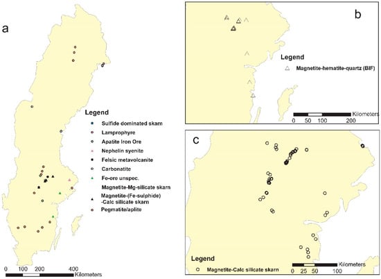 Simplified location map of samples in the EURARE project: (a) an overview of sample locations and types, excluding magnetite-calc silicate skarn and BIF ones; (b) magnetite-hematite-quartz samples; (c) magnetite-calc silicate skarn samples.