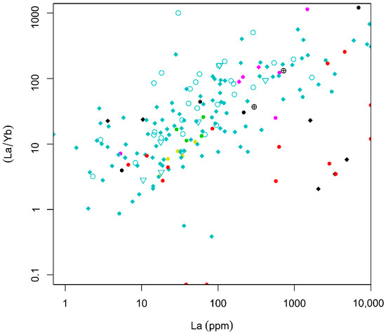 A bivariate plot of La vs. La/Yb (Figure 6) shows a weak but overall positive correlation between the two variables, except for a few samples, which show higher HREE contents. This suggests that those samples with a high LREE content also have relatively high LREE/HREE ratios. They mostly represent REE mineralizations associated with granitic pegmatites. One sample from iron oxide-apatite deposits contains REE-bearing minerals such as xenotime and monazite and shows higher contents of HREEs (Figure 6).